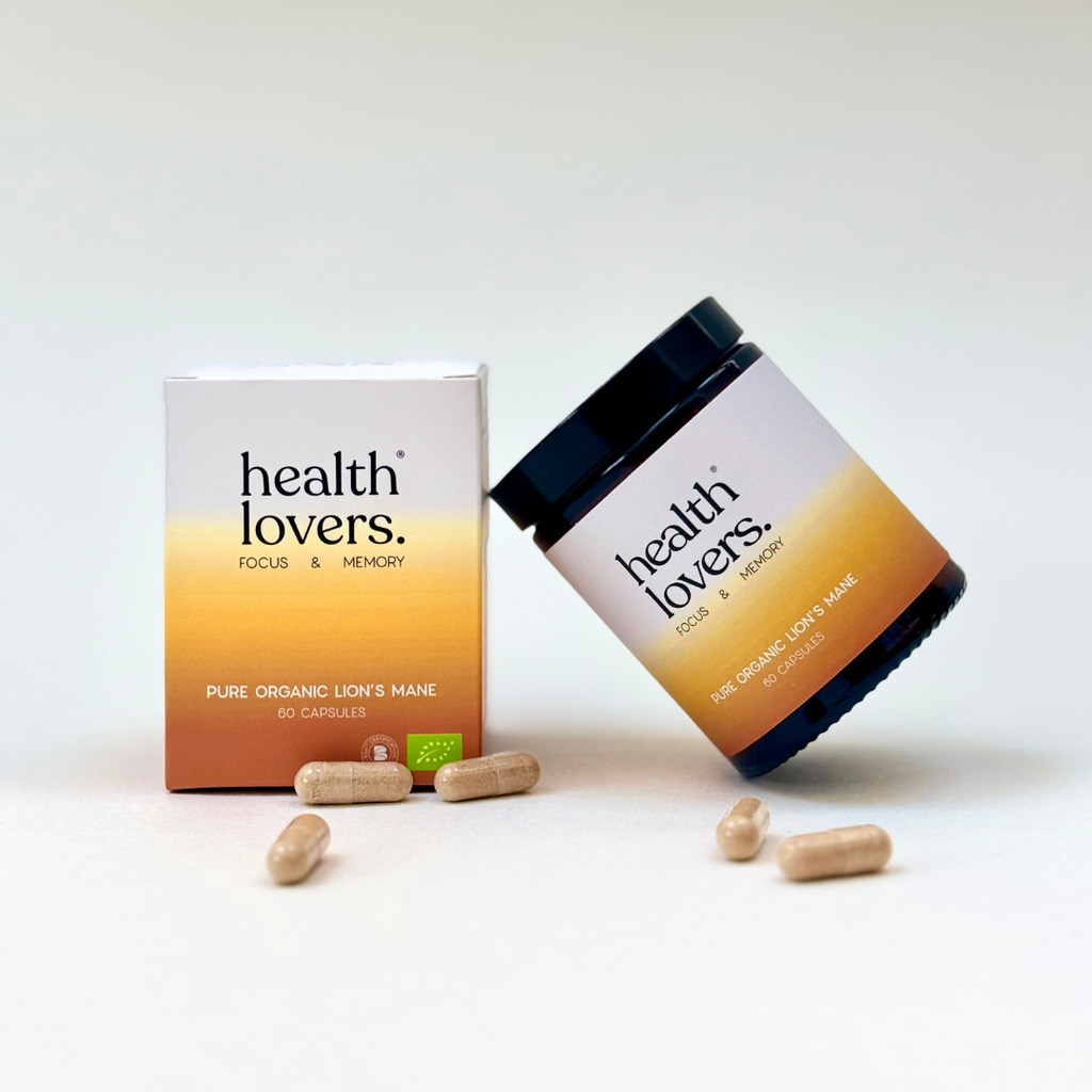 Health Lovers organic lions mane supplement container and capsules on a white background