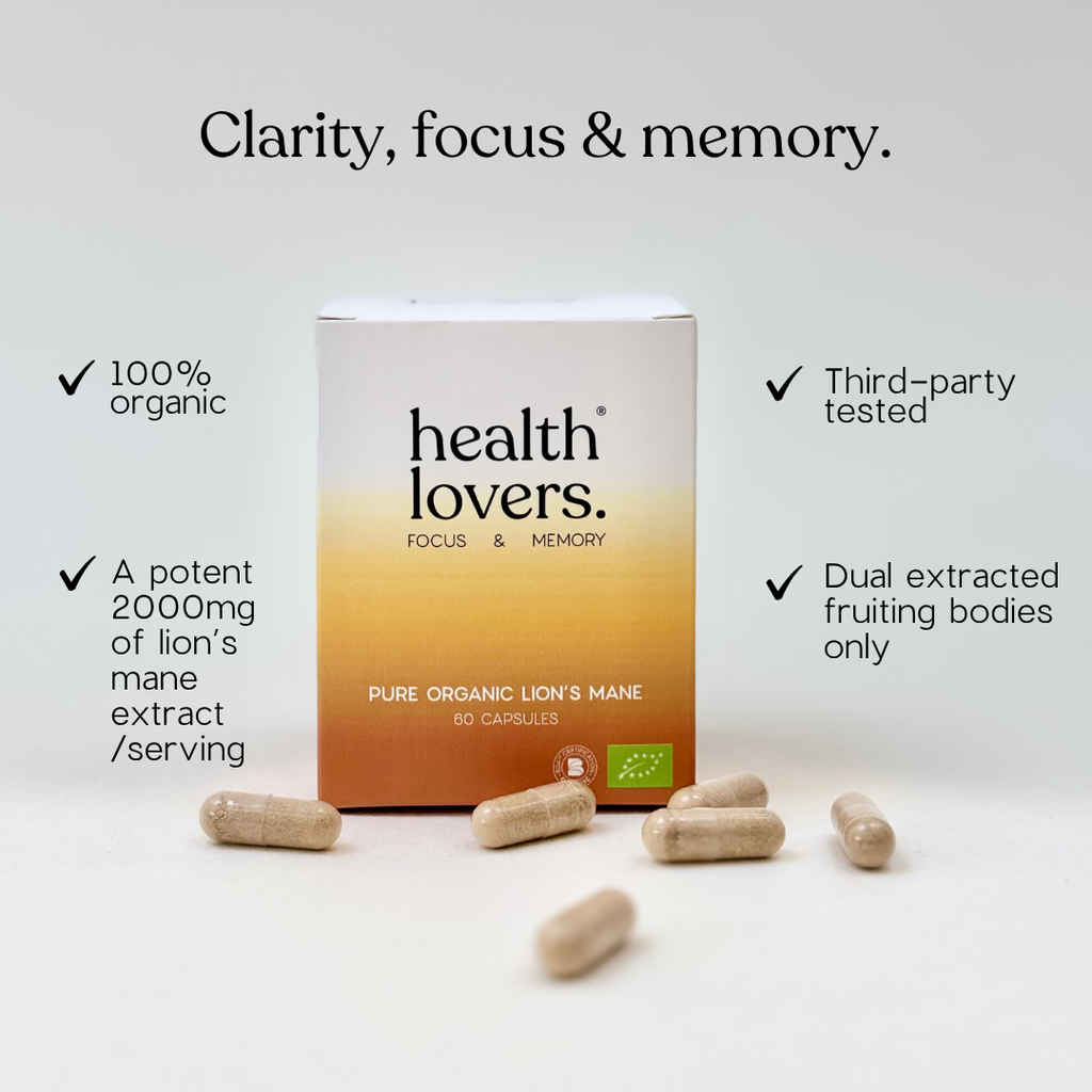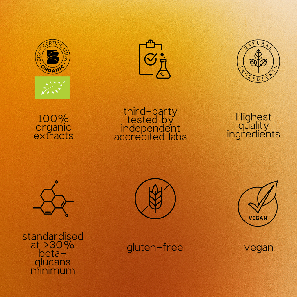 Our organic Lion’s Mane capsules are formulated to help improve focus and memory naturally - with 100% fruiting-body dual extract, standardised to over 30% beta-glucans.